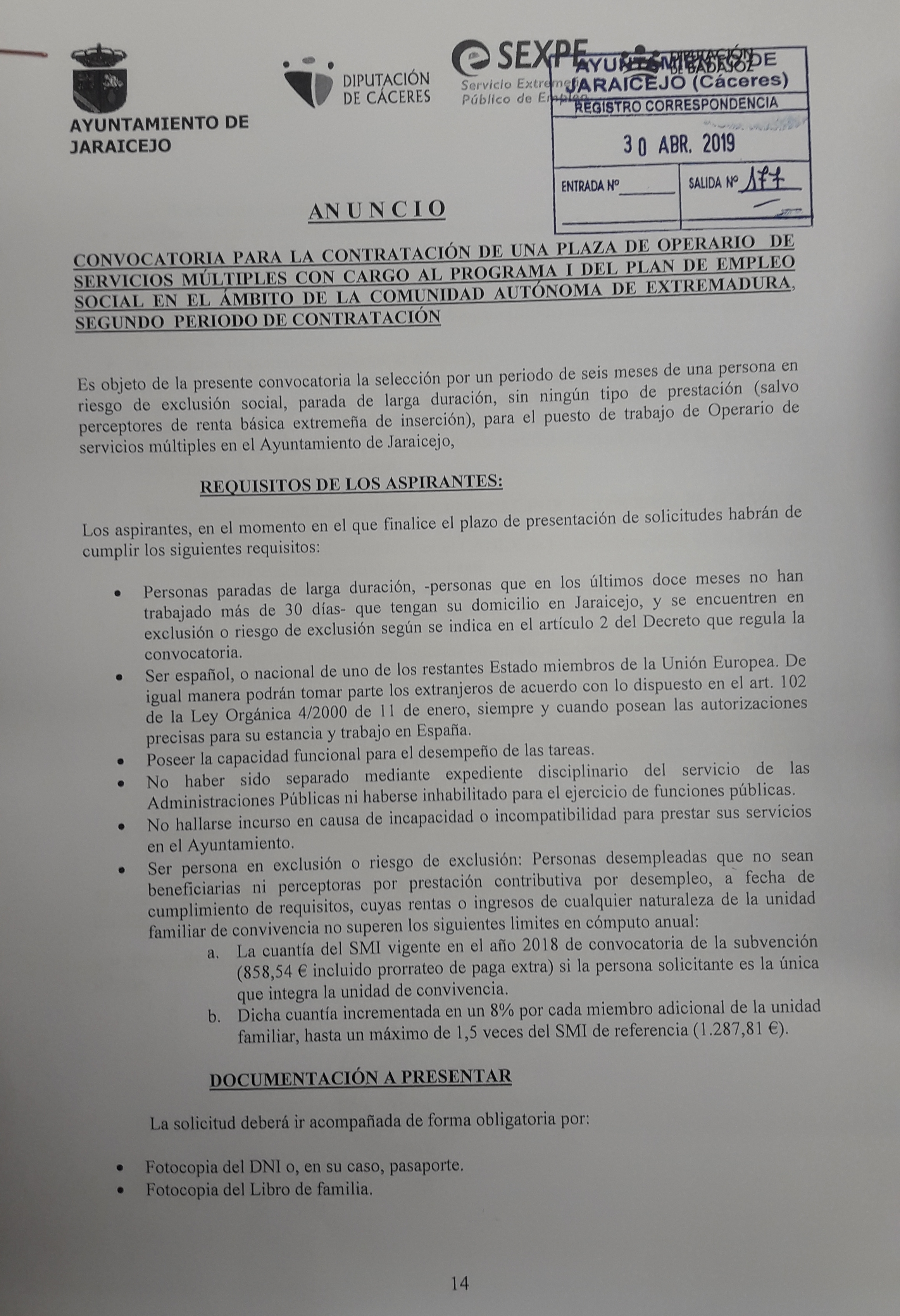 Buenos días, está abierto el plazo para la presentación de solicitudes para una plaza de operario de servicios múltiples con cargo al programa de plan de empleo social. La jornada laboral tendrá una duración de 6 meses.