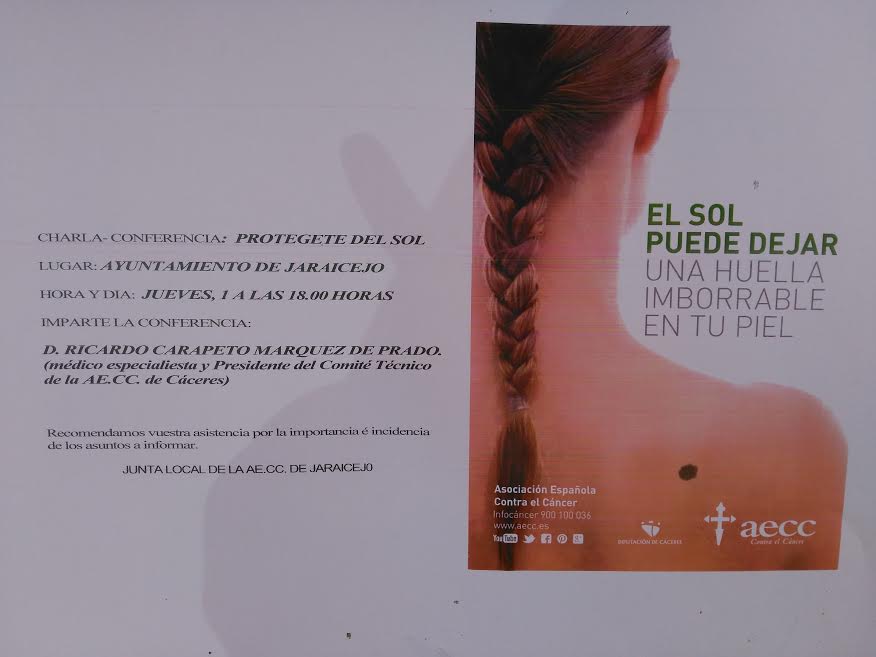 Buenos días, mañana día 1 de Junio a las 18:00 horas en el salón de actos del EXCMO. Ayuntamiento se celebrará una charla informativa sobre el cáncer de piel .