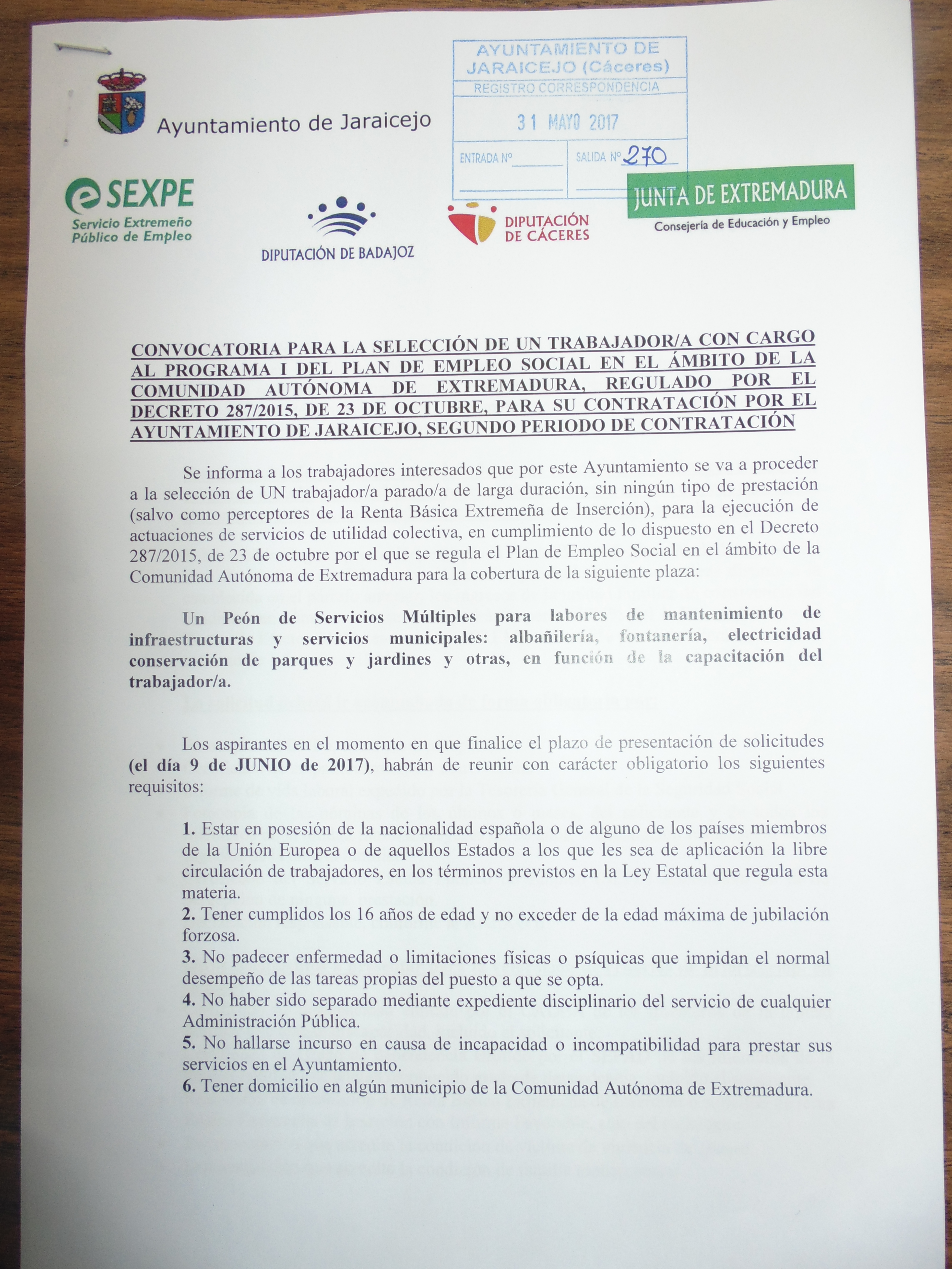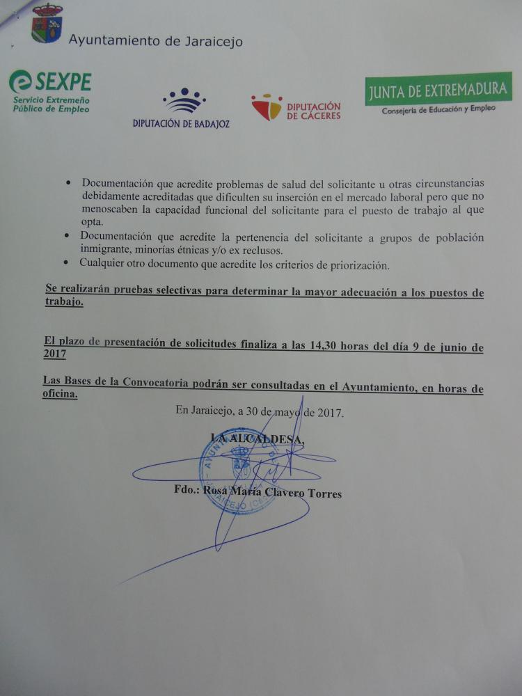 Hasta el día 9 de junio está abierto el plazo de presentación de solicitudes para optar a una plaza de "Peón de servicios múltiples" para labores de mantenimiento y servicios municipales.