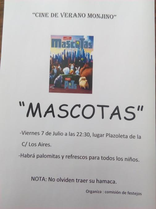 Buenos días! Continuamos con el cine de verano, este viernes se proyectará la película de dibujos animados: "Mascotas". El lugar de proyección será...