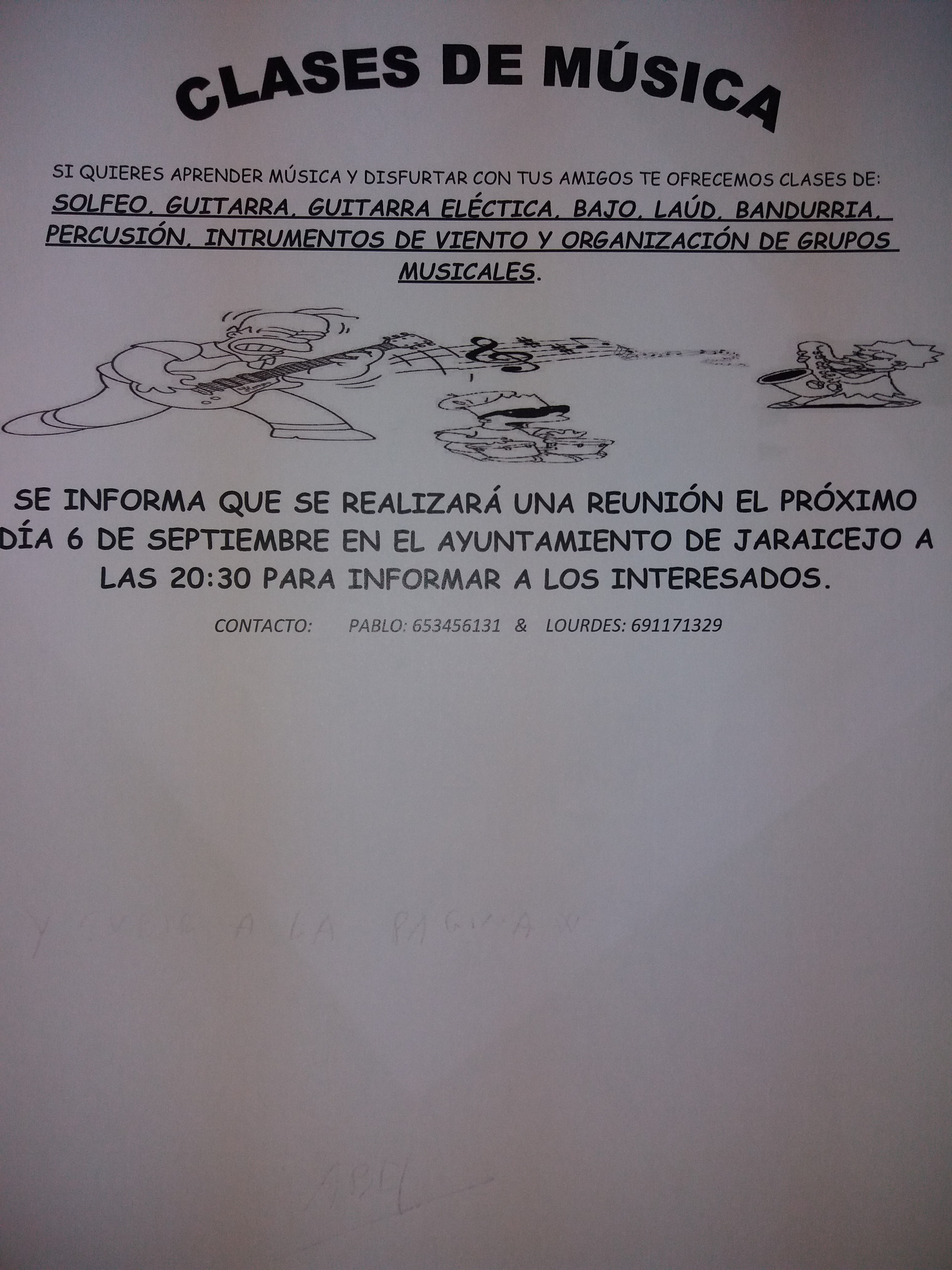 Buenos días, el próximo miércoles dia 6 de septiembre tendrá lugar una reunión en el Ayuntamiento para informar a todas las personas interesadas en recibir clases de musica.