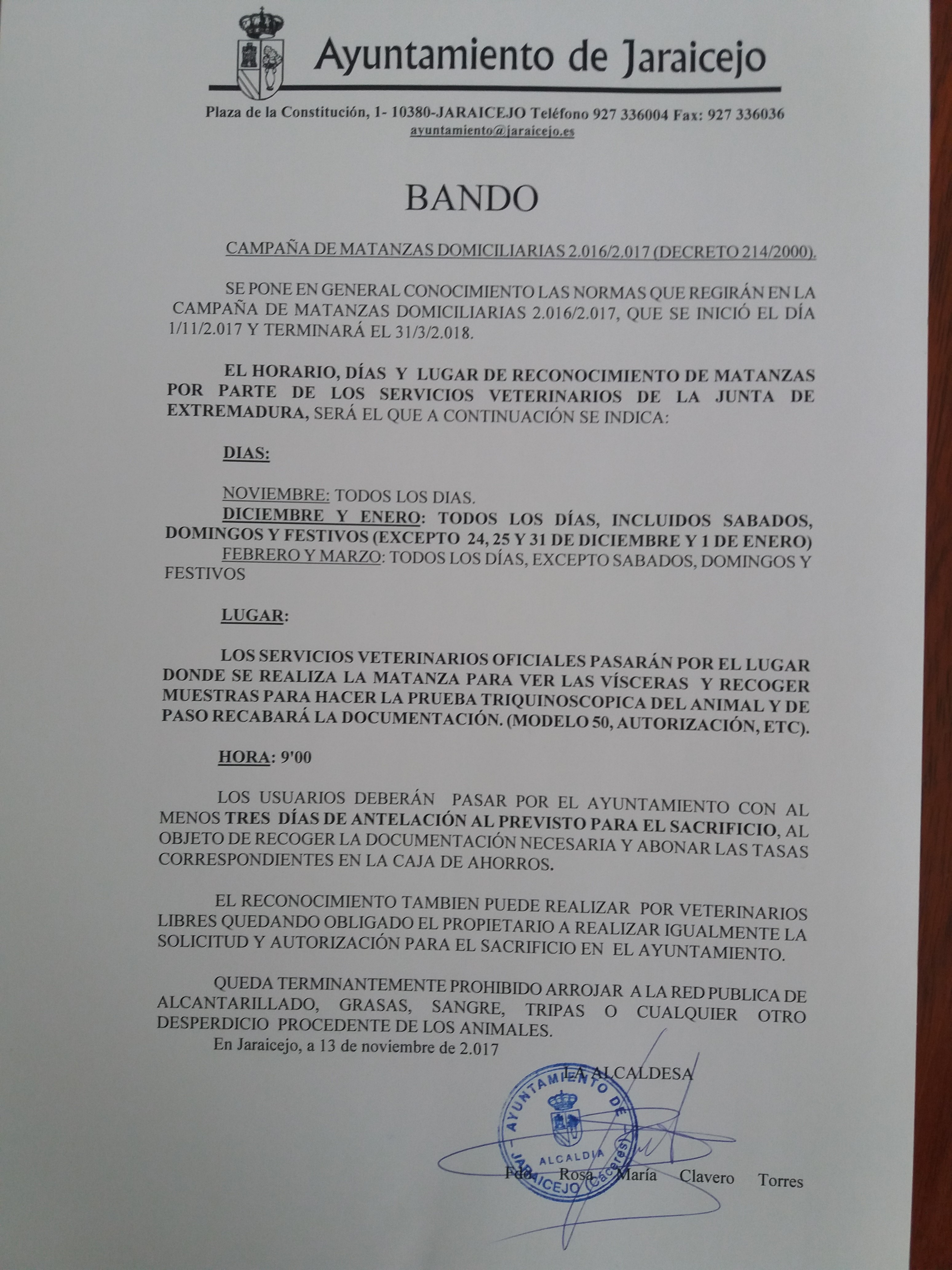 Los usuarios deberán pasar por el Ayuntamiento con al menos 3 días de antelacion al previsto para el sacrificio, al objeto e recoger la documentación necesaria y abonar las tasas correspondientes.