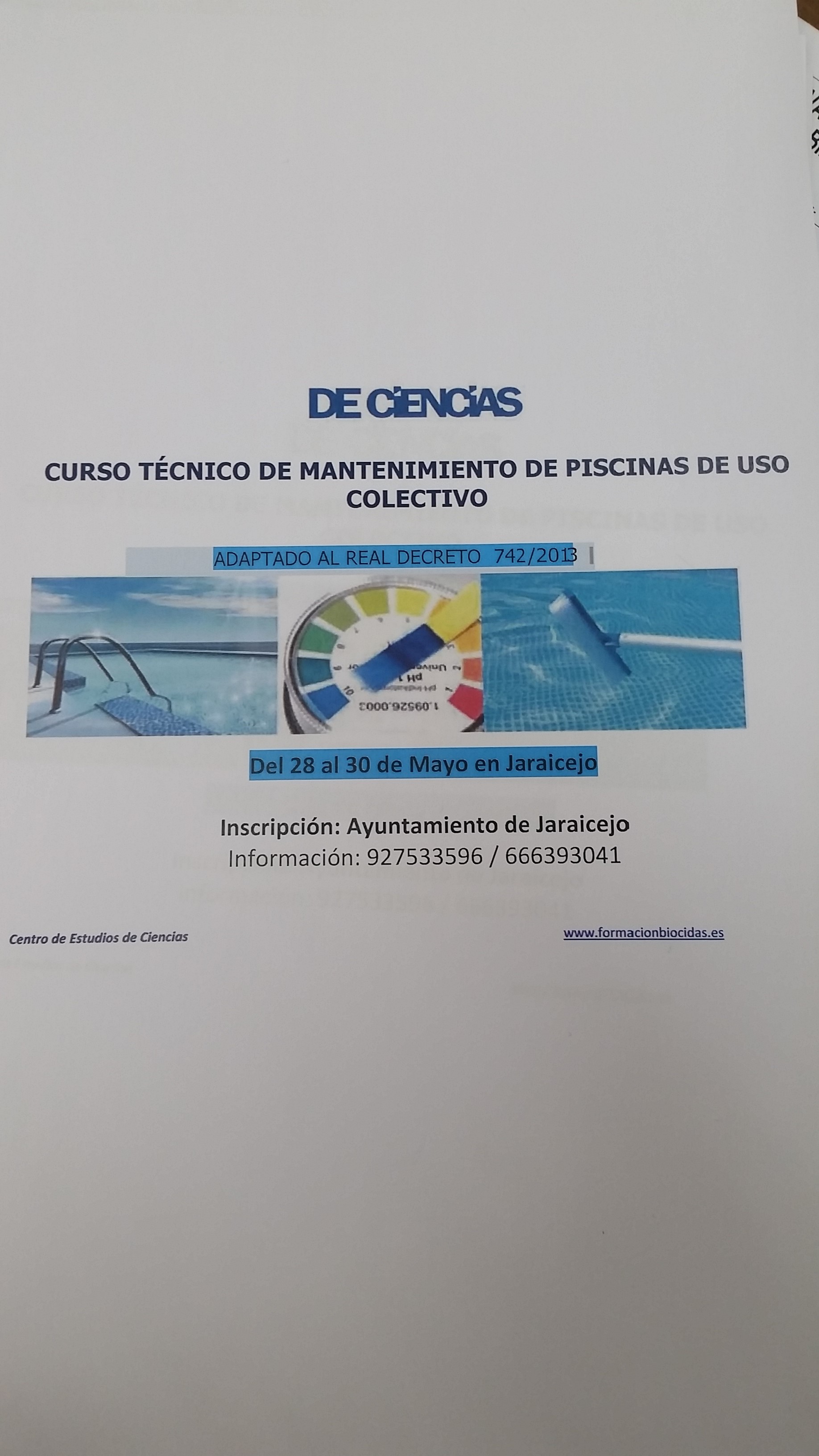 BUENOS DIAS, DEL 28 AL 30 DE MAYO EN JARAICEJO SE VA A IMPARTIR UN CURSO TECNICO DE MANTENIMIENTO DE PISCINAS DE USO COLECTIVO.