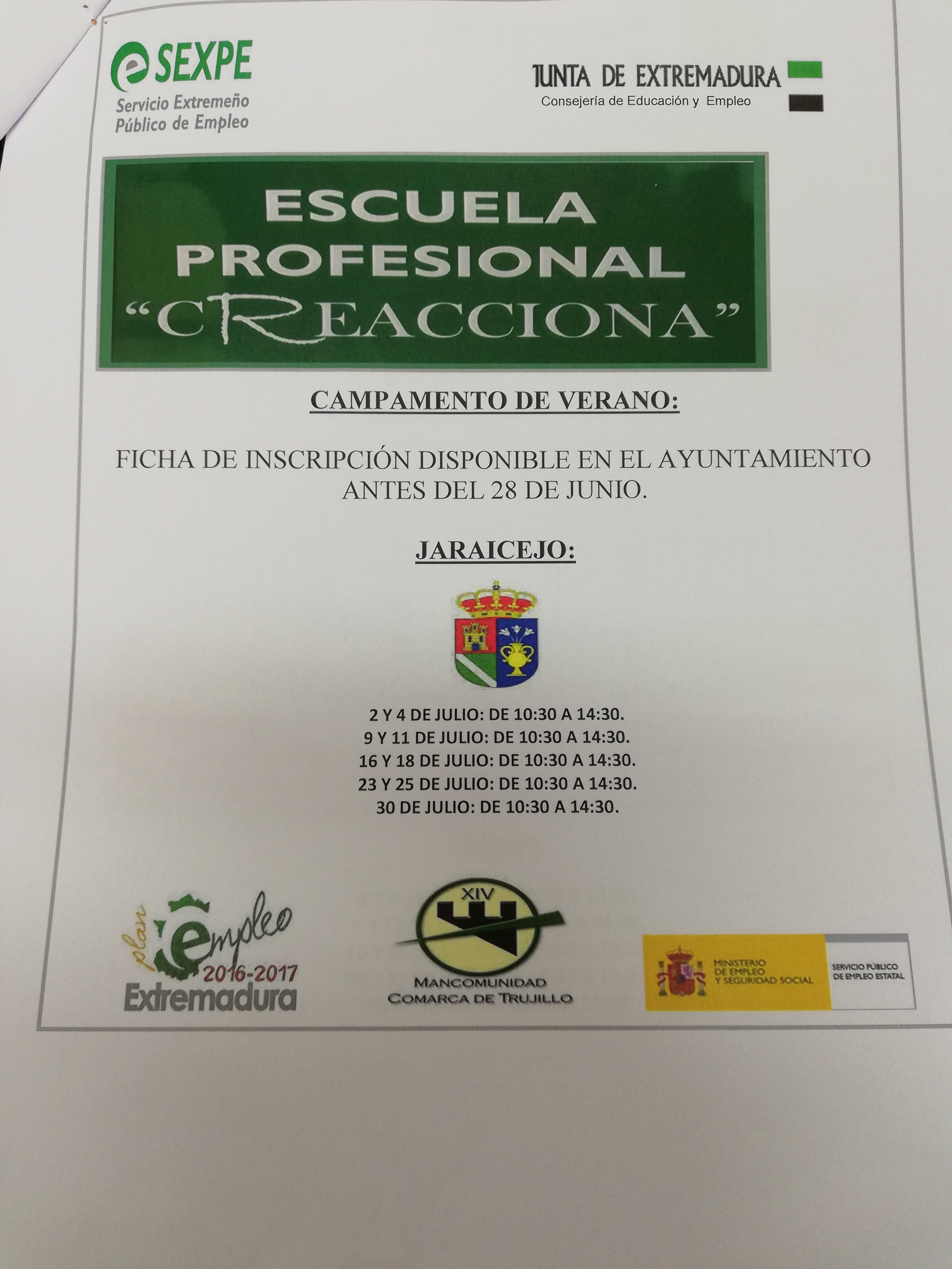 BUENOS DIAS, LA MANCOMUNIDAD DE TRUJILLO, A TRAVES DE SU ESCUELA PROFESIONAL "CREACCIONA", VA A PROPOCIONAR A DISTINTAS LOCALIDADES INCLUIDA EN ELLAS JARAICEJO EL SERVICIO DE "CAMPAMENTO DE VERANO" PARA LOS MÁS PEQUEÑOS DE LA CASA. EDADES: ( DE 4 A 13 APROXIMADAMENTE).