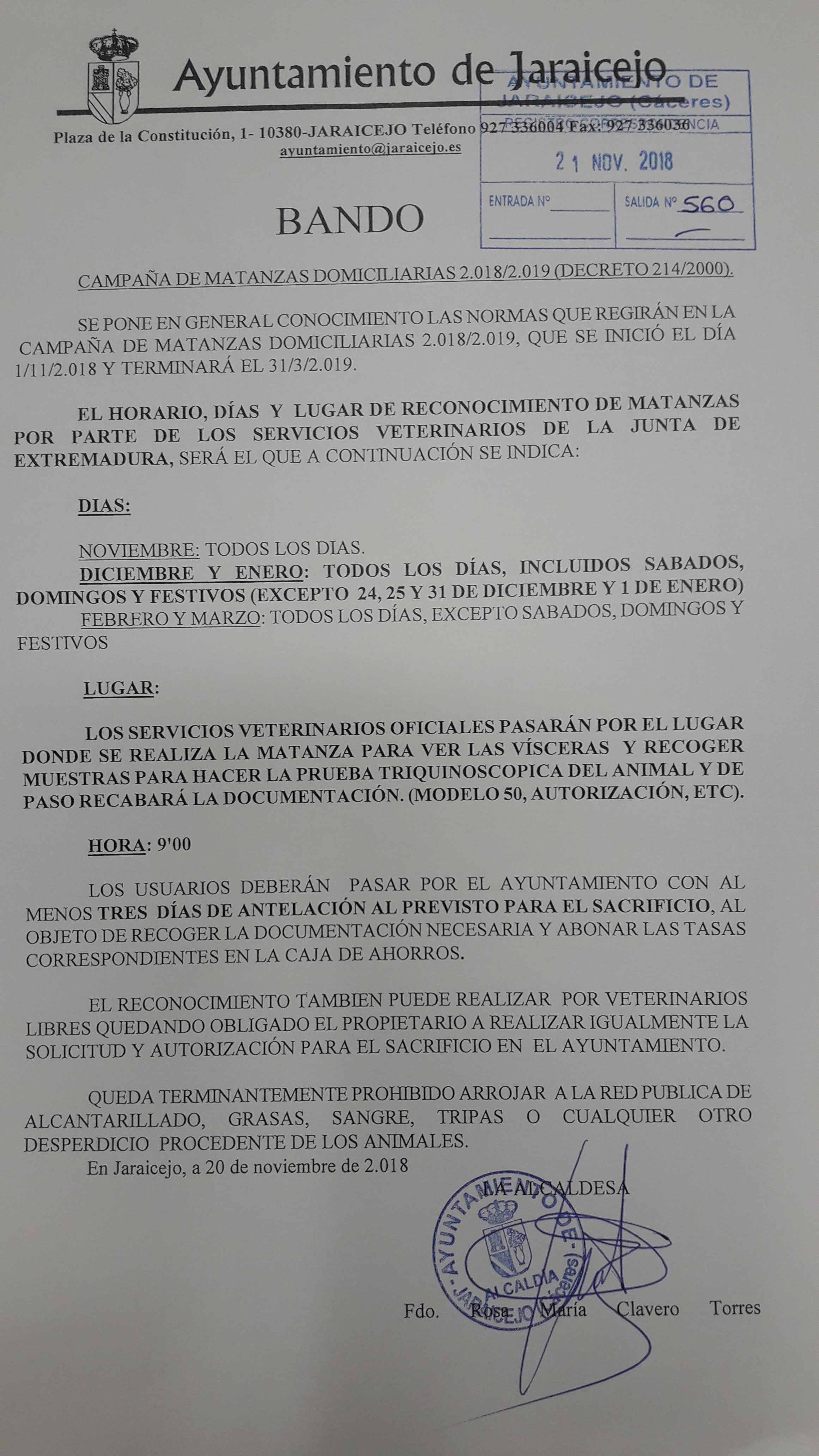 Buenos días, se pone en conocimiento el inicio de la campaña de matanzas domiciliarias 2018/2019.