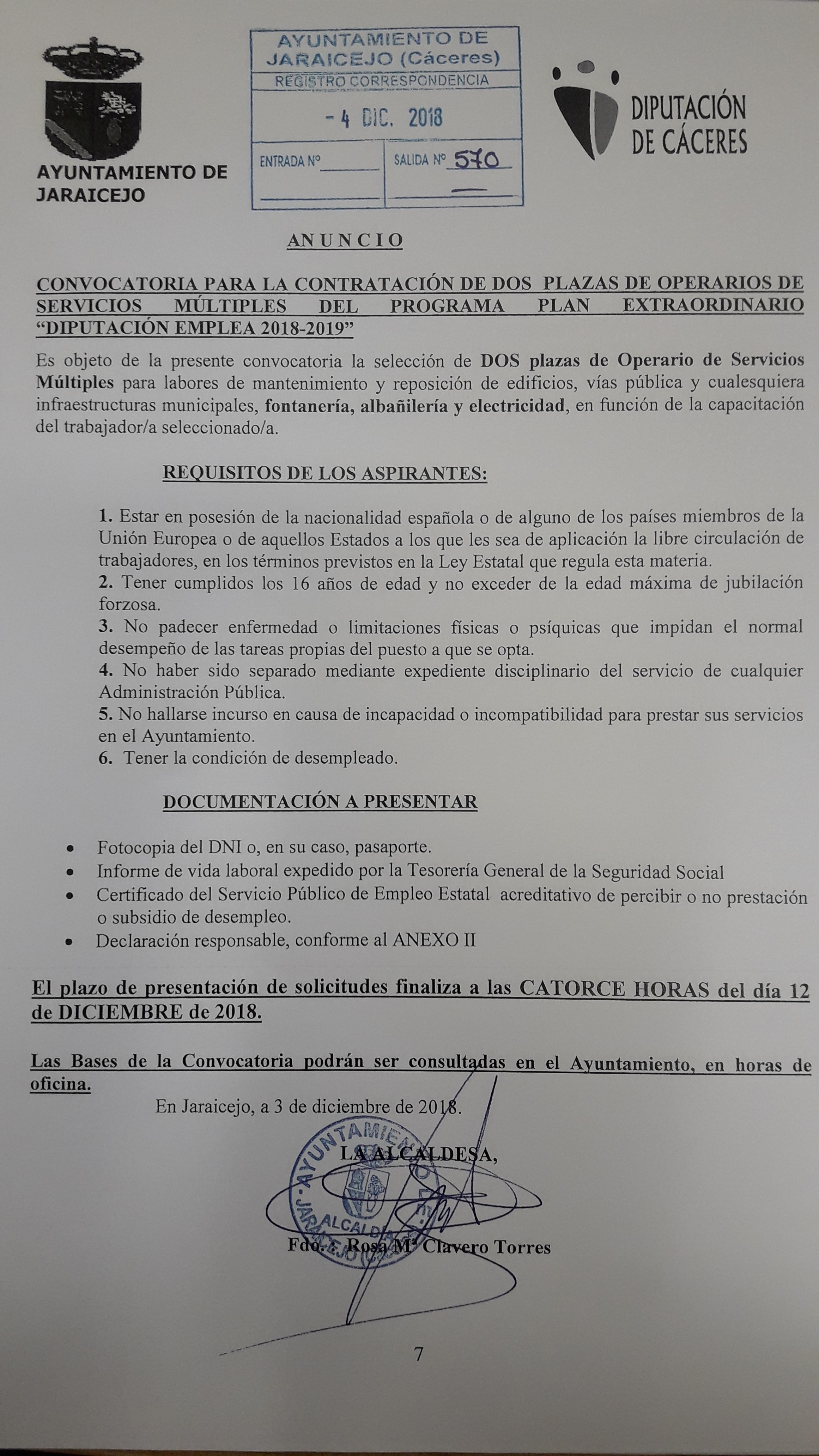 Buenos días, está abierto el plazo para la presentación de solicitudes de dos nuevas plazas de operarios de servicios múltiples del programa plan extraordinario "Diputación emplea 2018/19".