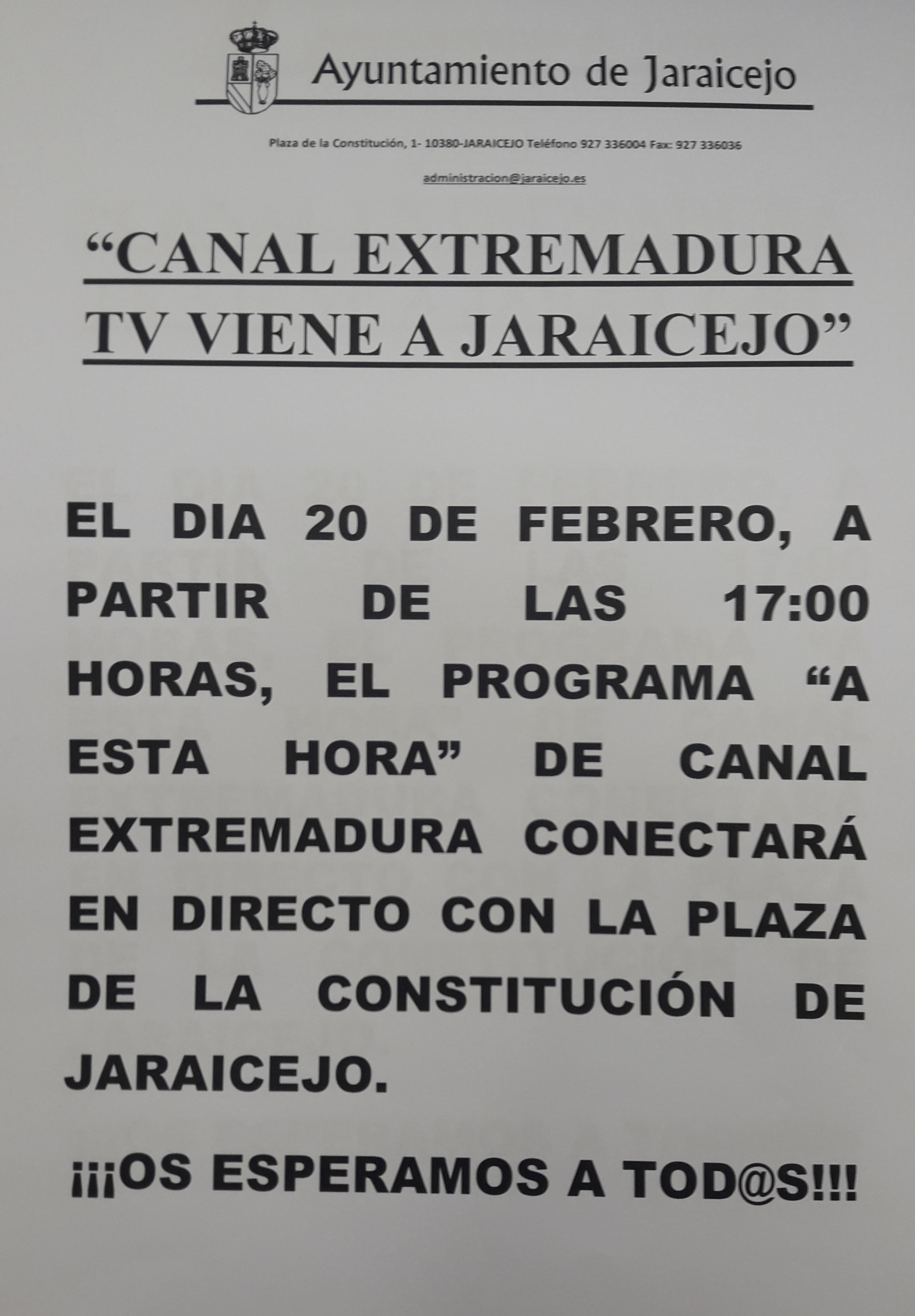 Buenos días, el próximo miércoles 20 de febrero a las 17.00h, el programa "A ESTA HORA" de Canal Extremadura conectará en directo con la Plaza de la Constitución de nuestro municipio.